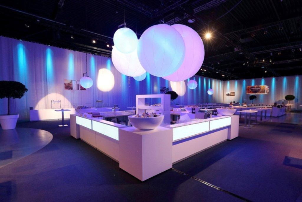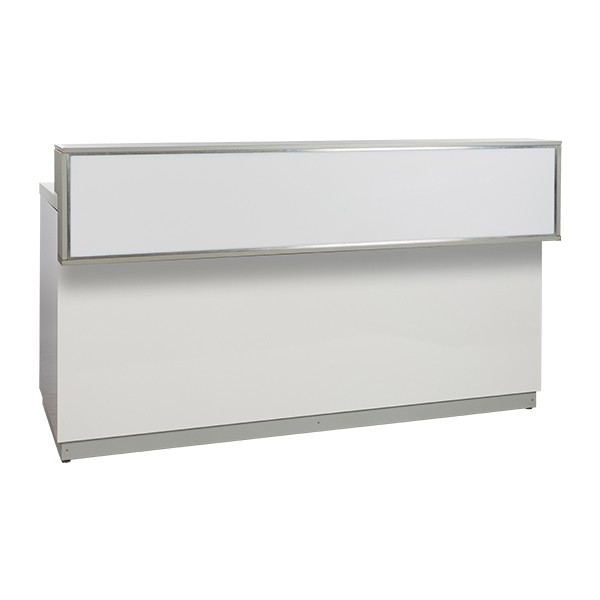 Exklusiv bardisk med arbetsyta i rostfritt stål och högglansigt vita fronter och sidor.