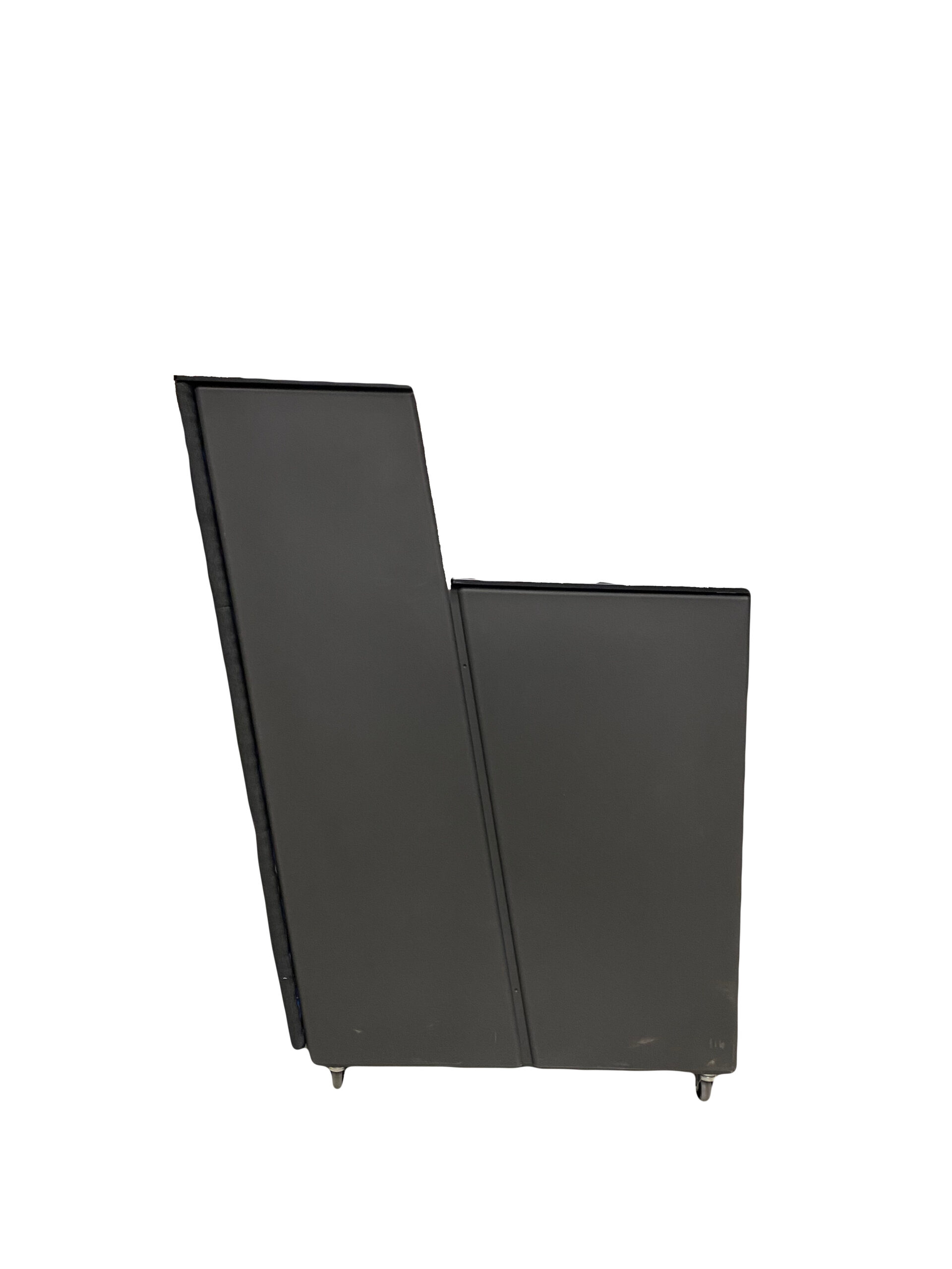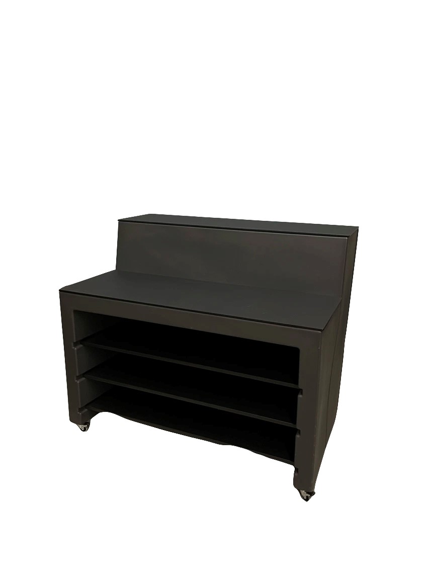 Modern bar på hjul. Antracitfärgad laminat och tygklädd front . Rejäl arbetsskiva och hyllor på baksidan.