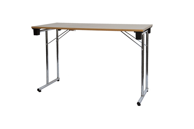 Fällbart bord med laminerad ek-skiva och kromad benställning. Ej utomhusbruk. Lämpligt för 2 personer