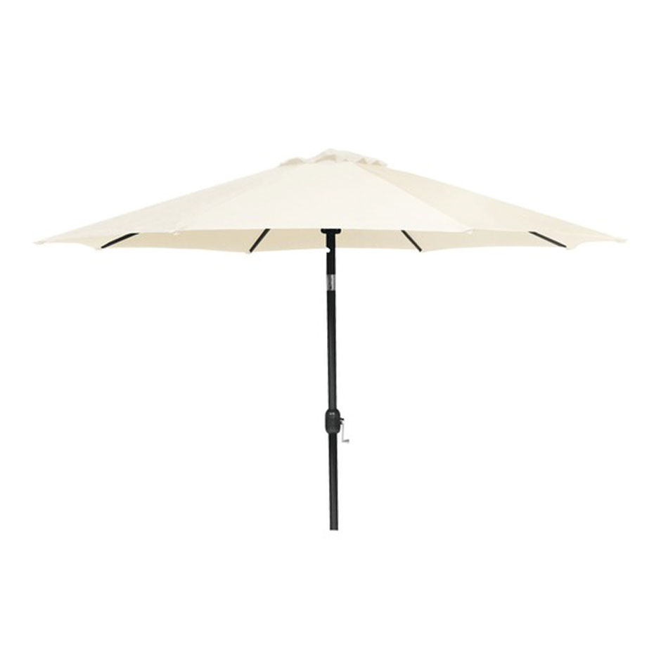 Stomme av svart aluminium och tyg av polyester. Parasollet är utrustat med vev och tilt. Veven gör det enkelt att fälla ned och fälla upp parasollet. En tilt ser till att du kan vinkla parasollet, praktiskt sent på kvällen eller tidigt på morgonen då solen står lågt. Parasollet är cirka 250 cm högt. Stången är cirka 48 mm i diameter