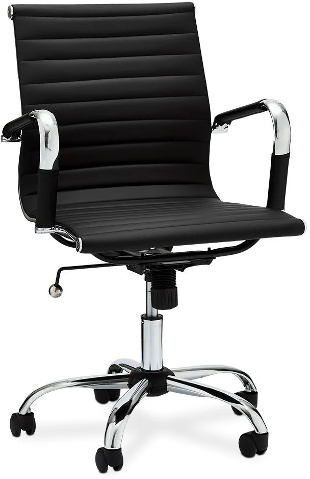 Roterande skrivbordsstols, svart skinn med armstöd i aluminium.